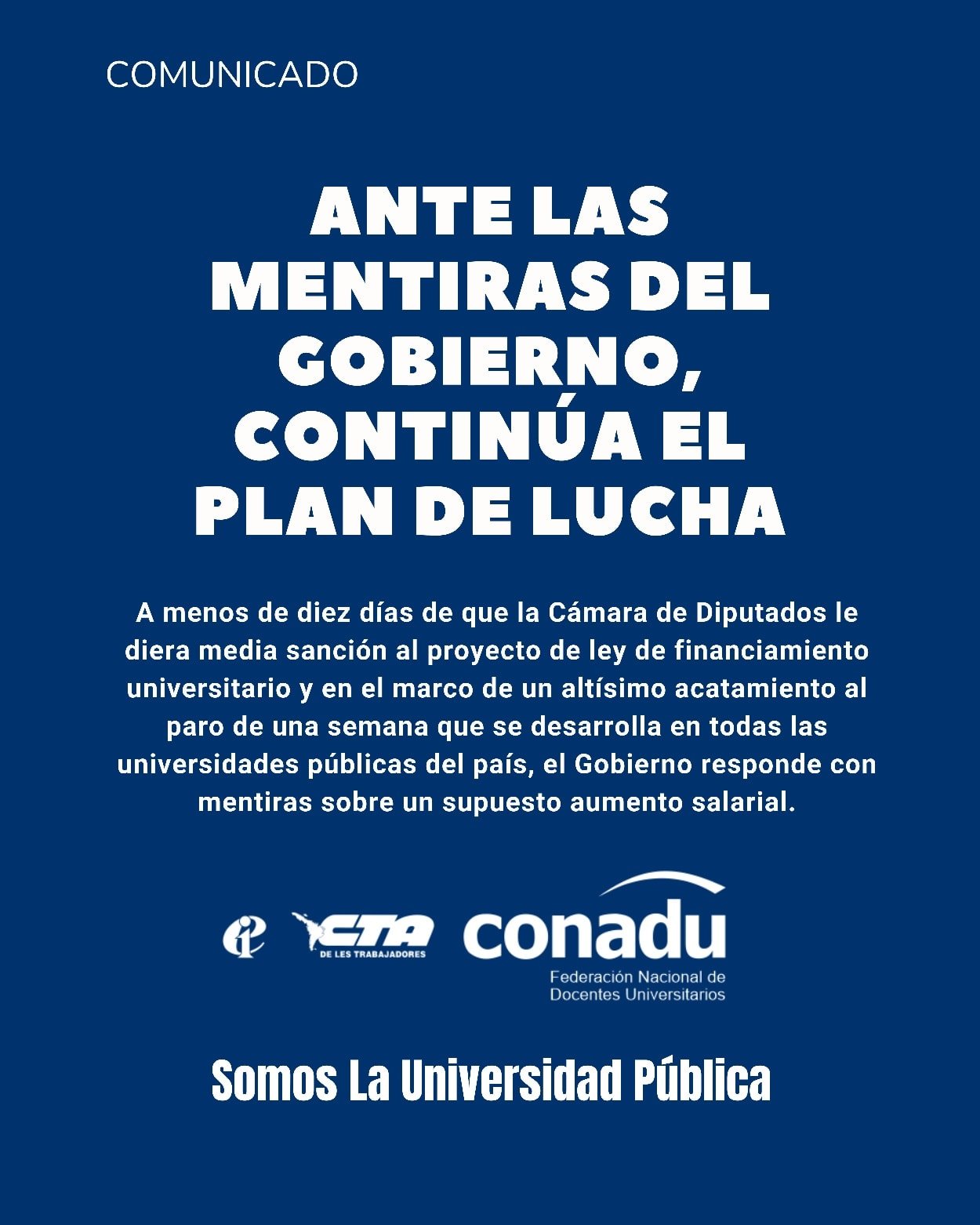 Como respuesta al contundente acatamiento al paro que se desarrolla esta semana en todas las universidades públicas del país, el gobierno nacional hizo anuncios mentirosos sobre un supuesto aumento salarial. Frente a las mentiras, junto a Conadu ratificamos la continuidad de la lucha con paro total esta semana, paros rotativos de 48 horas en los próximos días y la construcción de una tercera gran Marcha Federal Universitaria a fines de mes. Estos parches que inventan están muy lejos de resolver la crisis salarial y presupuestaria del sistema universitario nacional.